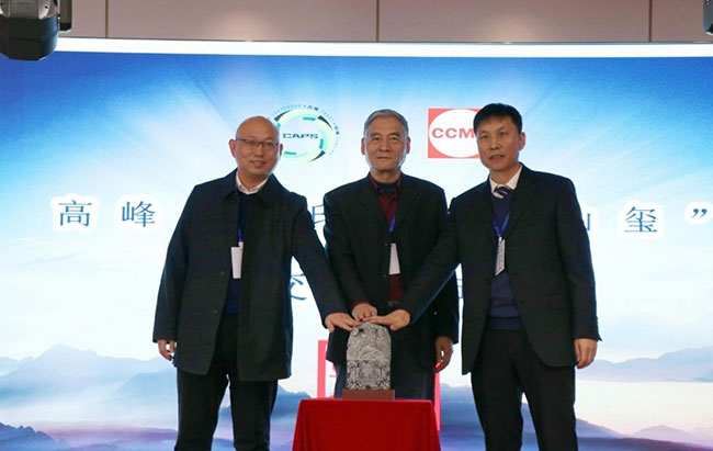 中國工程機械工業(yè)協(xié)會筑養(yǎng)路機械分會會長焦生杰(中)的見證下,河南亞龍智能裝備有限公司總經(jīng)理張大禹向吉林省公路機械有限公司總經(jīng)理邵永祥移交峰會印信“泰山璽”。